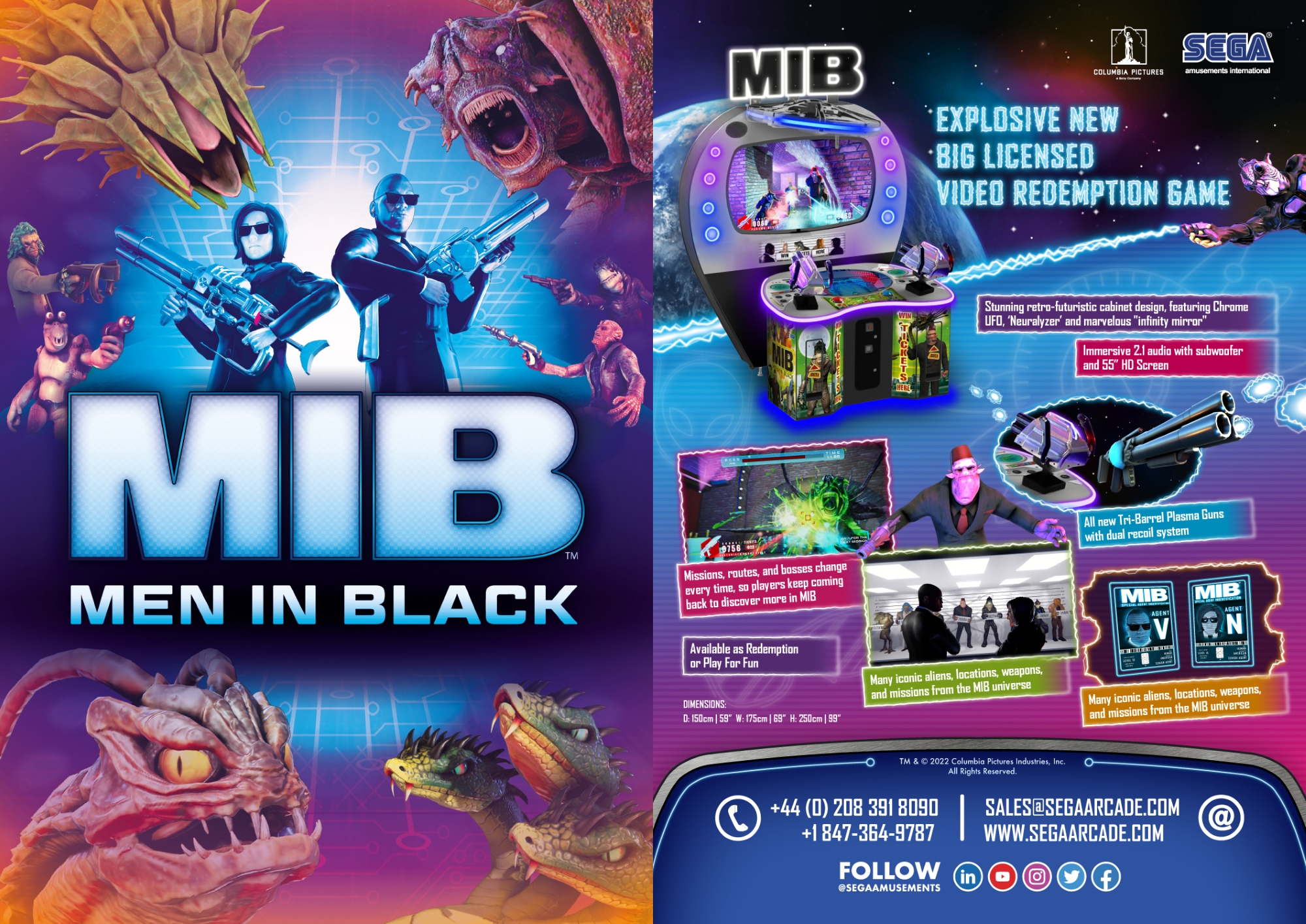 La jugabilidad dinámica y en constante evolución asegura que ninguna partida sea igual a otra. Las misiones, enemigos, rutas y jefes cambian en cada ronda, manteniendo el desafío fresco y emocionante. Al final de cada partida, los jugadores reciben un adelanto de la siguiente misión, incentivando a seguir jugando y mejorando sus puntuaciones. Con su acción rápida, impresionante pantalla HD de 55” y un sistema de audio envolvente 2.1 con un subwoofer de 12”, Men in Black ofrece una experiencia cinematográfica completa que cautivará a jugadores de todas las edades.