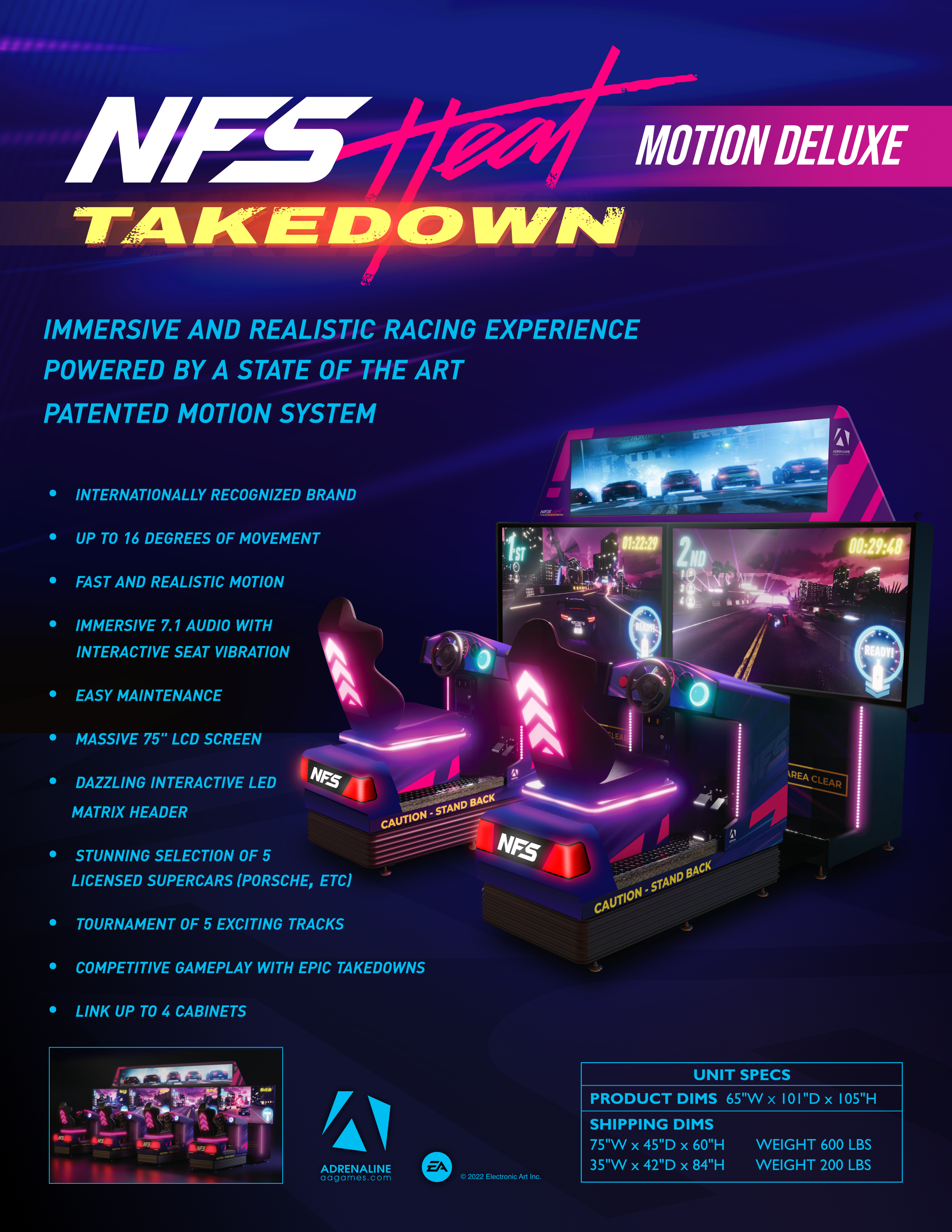 ¡Experimenta la inmersión definitiva en las carreras arcade con NFS Heat Takedown Motion de Adrenaline! Este juego trepidante lleva la emocionante acción de la franquicia Need for Speed a un nuevo nivel con un sistema de movimiento patentado de vanguardia. Los jugadores sentirán cada giro, choque y salto con hasta 16 grados de movimiento, creando una experiencia de carreras increíblemente realista y emocionante.